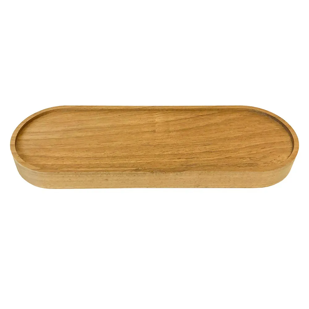 Bandeja em madeira com design oval, ideal para apoiar kit higiene com elegância.