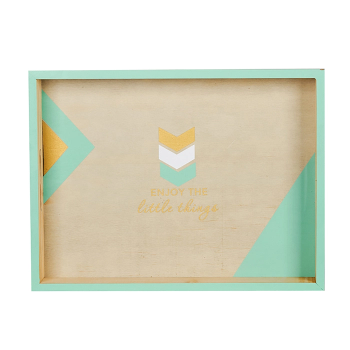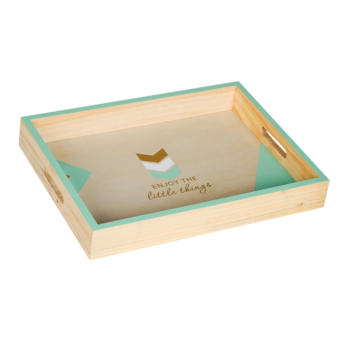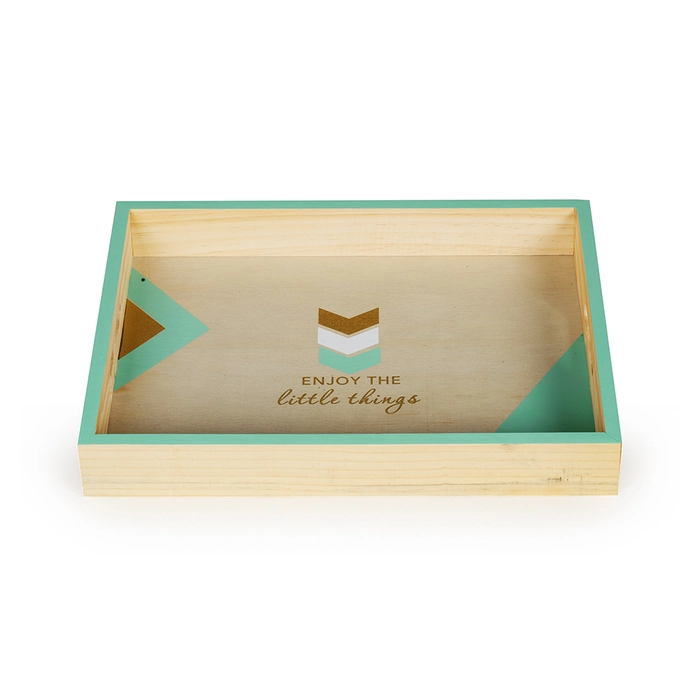 Bandeja em madeira com detalhes em verde, ideal para organizar kit higiene com charme.