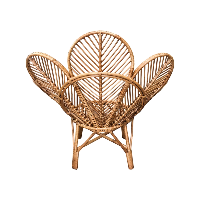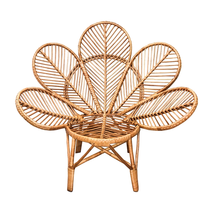 Cadeira em vime com design em pétalas, ideal para momentos de amamentação e aconchego.