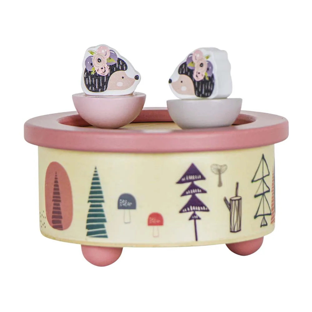 Caixa de música em madeira com porco-espinho rosa, perfeita para decorar com encanto e delicadeza.