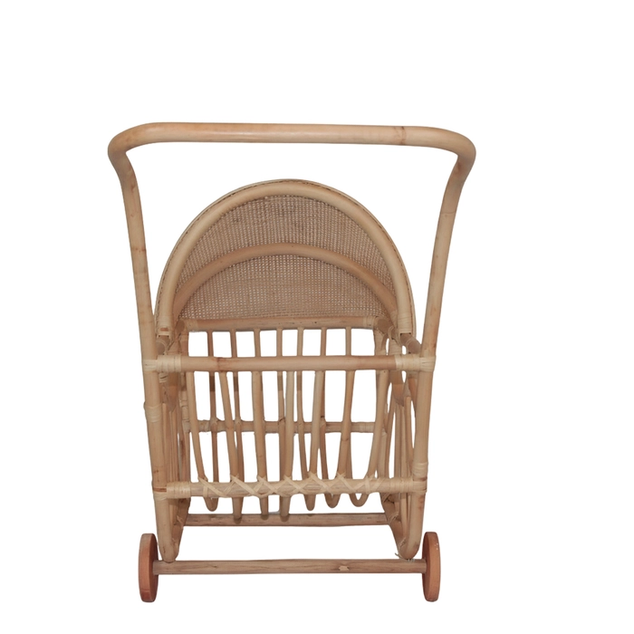 Carrinho de boneca em rattan e bambu, ideal para brincadeiras delicadas e decoração.