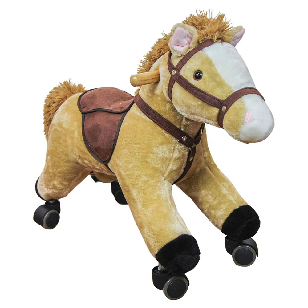 Cavalinho com rodinhas em plush e madeira, ideal para brincar e decorar com charme.
