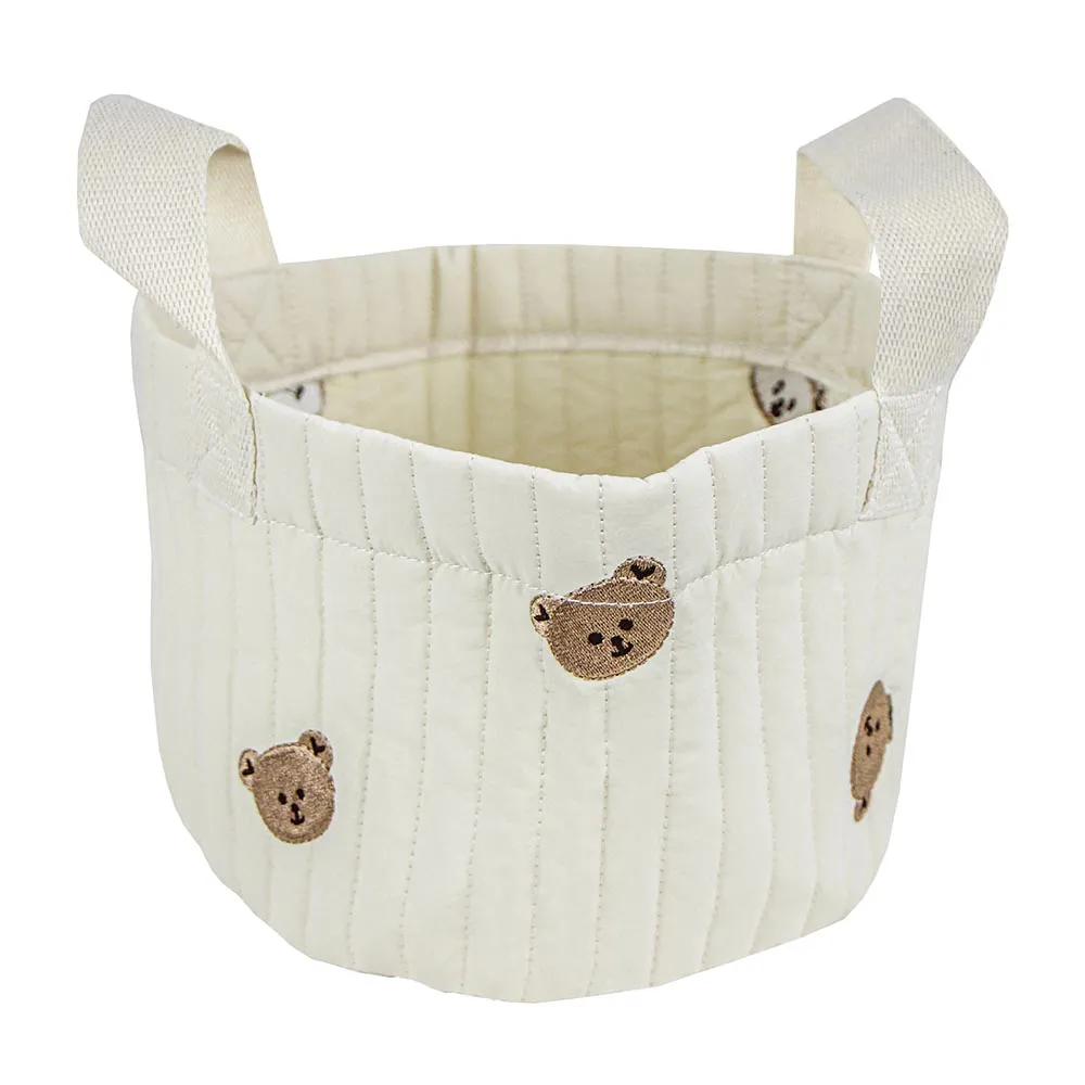 Cesto organizador em algodão com bordado de urso, ideal para manter a cômoda organizada.