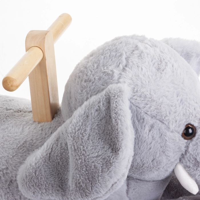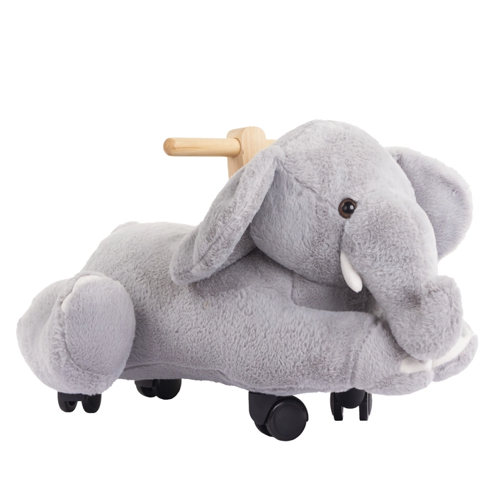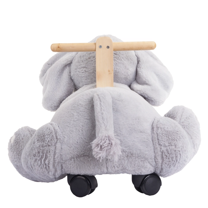 Elefante de rodinhas em poliéster e madeira, ideal para brincar e decorar com charme.