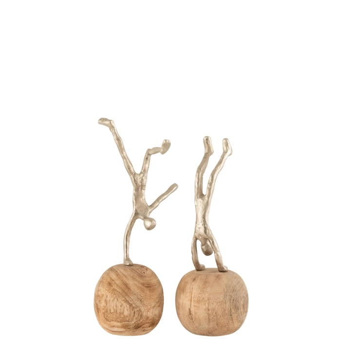 Escultura figura na bola em alumínio e madeira, ideal para compor a decoração com arte, equilíbrio e originalidade. Perfeita para ambientes sofisticados.