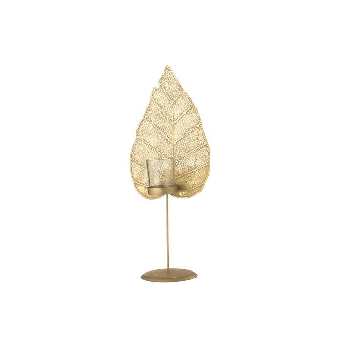 Escultura folha em metal com castiçal, ideal para unir arte, iluminação e sofisticação na decoração. Perfeita para mesas, aparadores e ambientes elegantes.