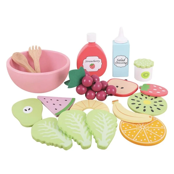 Jogo de salada em madeira, ideal para brincadeiras criativas e faz de conta.