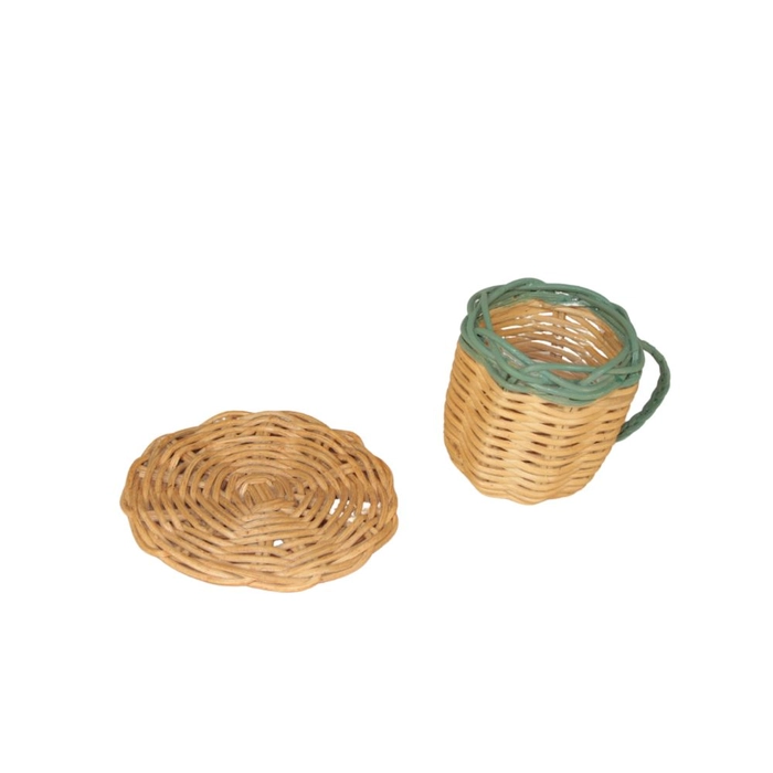 Jogo de xícara em rattan, ideal para brincadeiras delicadas e decoração infantil.
