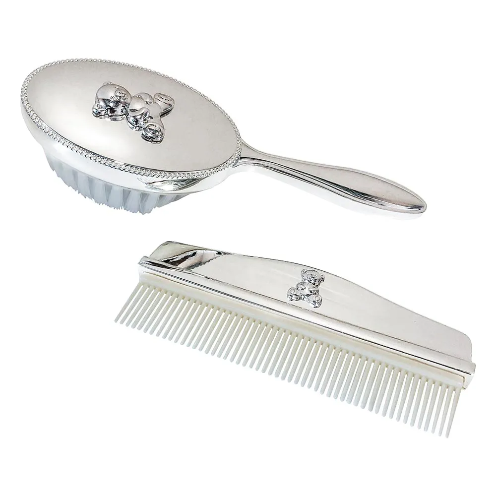 Jogo pente e escova em liga de zinco, ideal para compor o kit higiene com elegância.