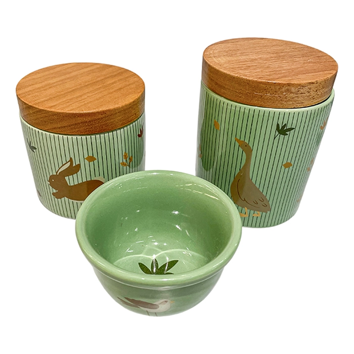 Kit higiene em porcelana com tampa de madeira, ideal para unir organização e delicadeza.
