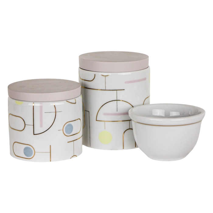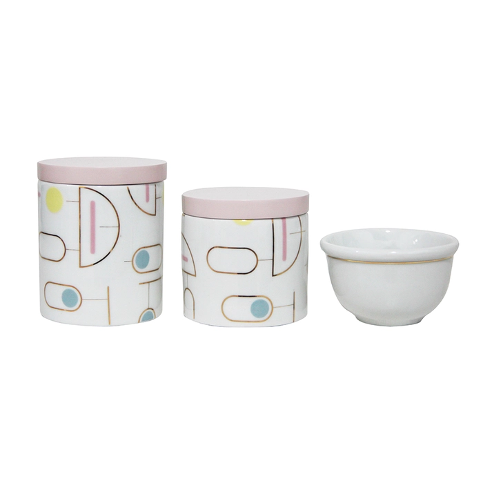 Kit higiene em porcelana com formas geométricas, ideal para decorar com elegância e estilo.