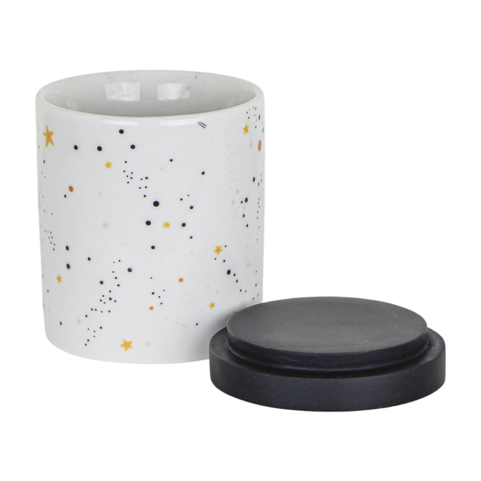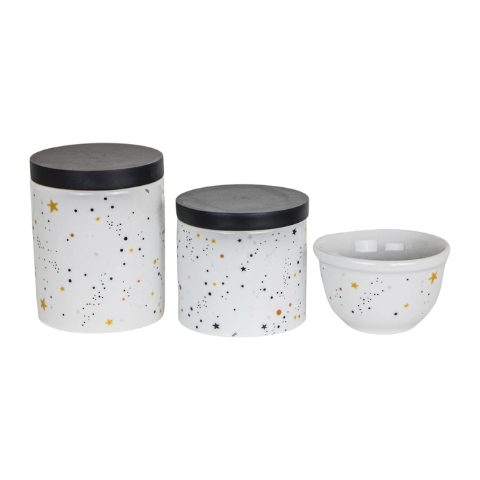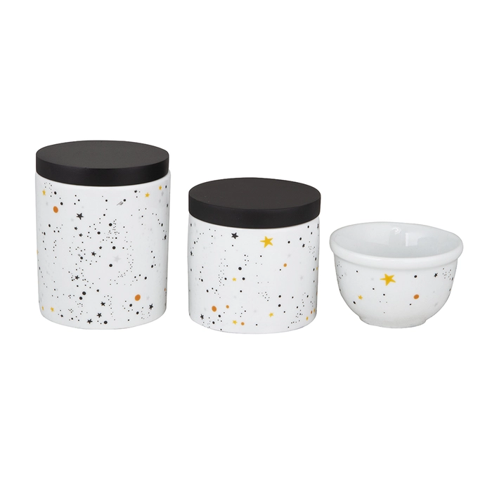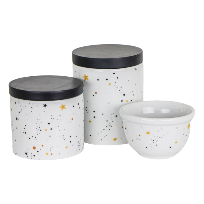 Kit higiene em porcelana com tema universo, ideal para organizar e decorar com charme.
