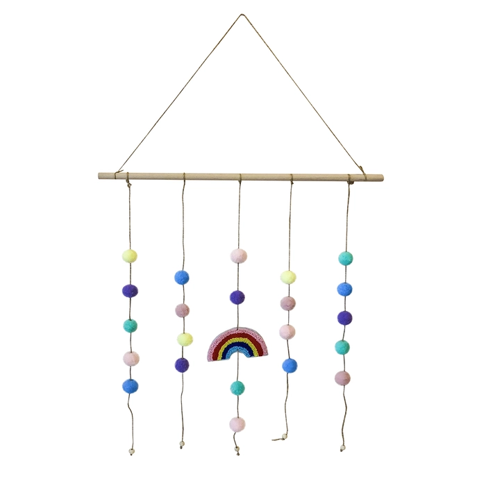 Móbile arco-íris em algodão e madeira, ideal para decorar o quarto infantil com delicadeza.