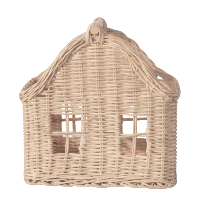 Organizador casinha em rattan, ideal para armazenar pequenos itens com charme natural.
