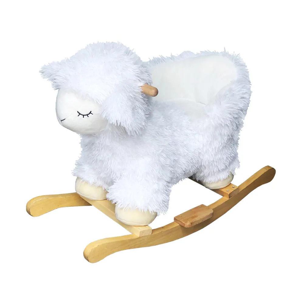 Ovelha de balanço musical em plush e madeira, ideal para brincar e decorar com encanto.