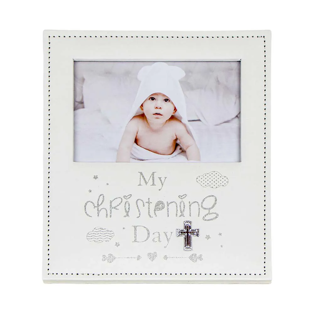 Porta-retrato em courino, ideal para registrar memórias de batizado com delicadeza.