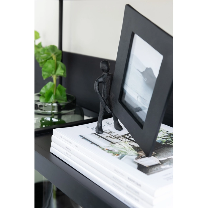 Porta-retrato com figura segurando moldura em alumínio, ideal para valorizar memórias com originalidade e charme decorativo. Perfeito para ambientes afetivos e elegantes.