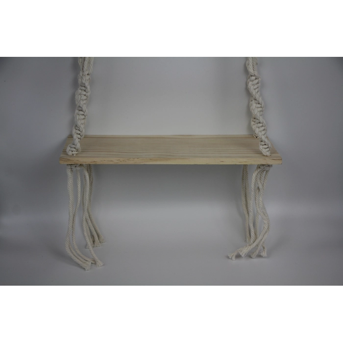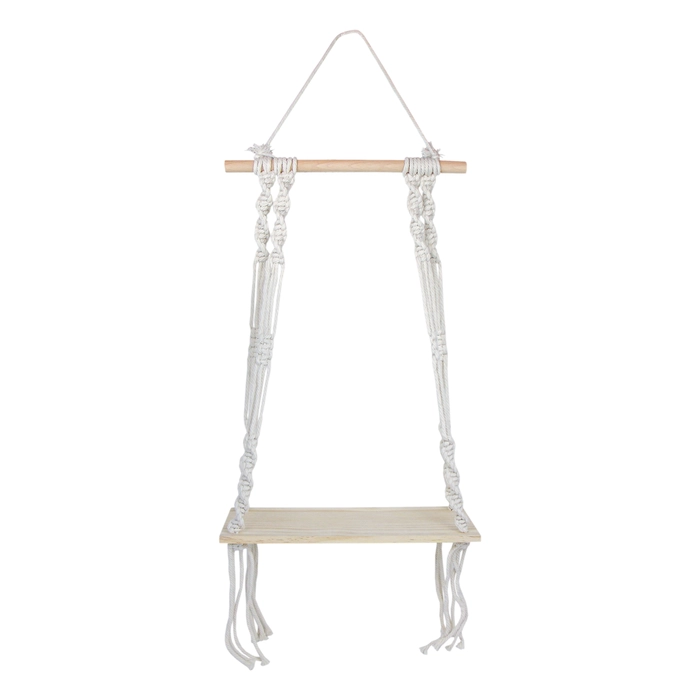 Prateleira em madeira com macramê, ideal para decorar e acomodar pequenos objetos.