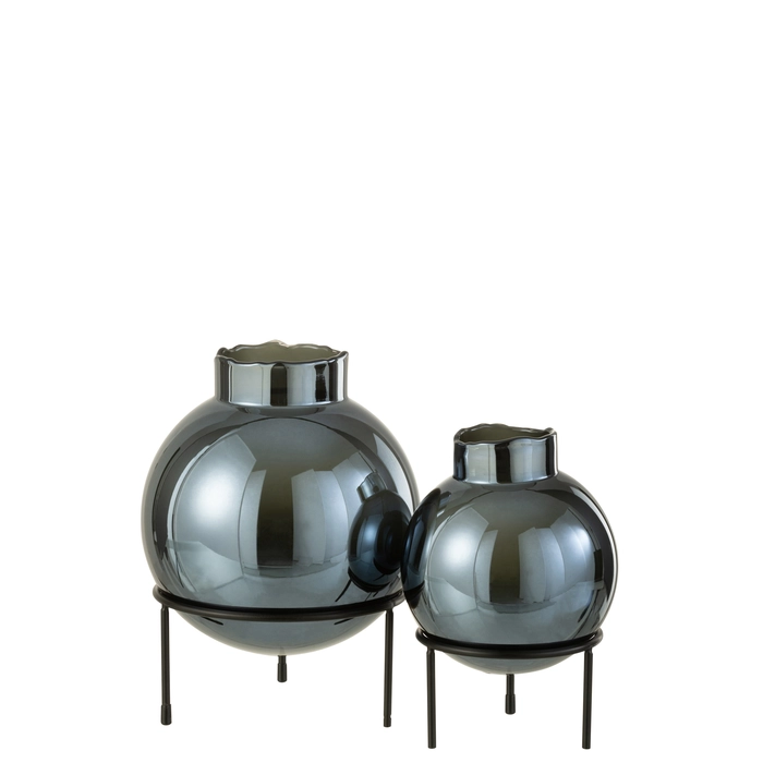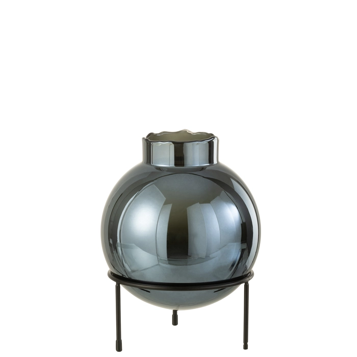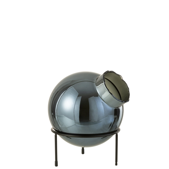 Vaso bola azul em vidro com suporte em metal 27x20x20cm