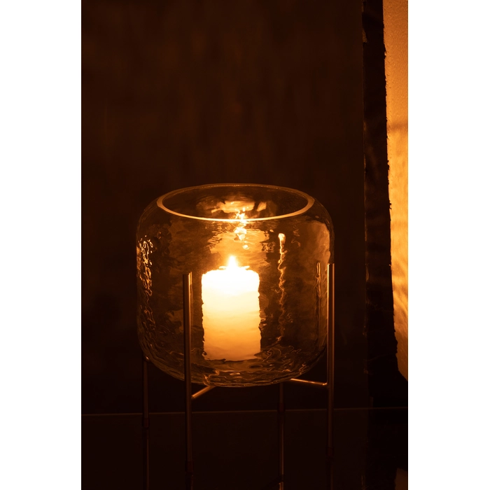 Vaso em vidro martelado com suporte em metal, ideal para compor a decoração com textura, leveza e sofisticação. Perfeito para arranjos e composições elegantes.